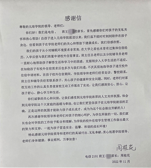 近日,信息与机电工程分院收到一封来自王某妈妈的感谢信,感谢学院老师一直以来对孩子在校外住宿期间的关心和爱护,感谢学院助力孩子成人成长成才。