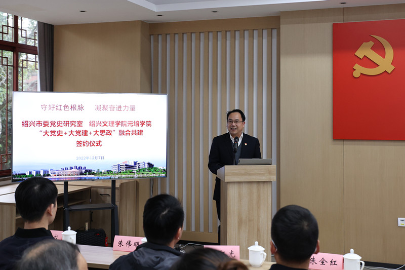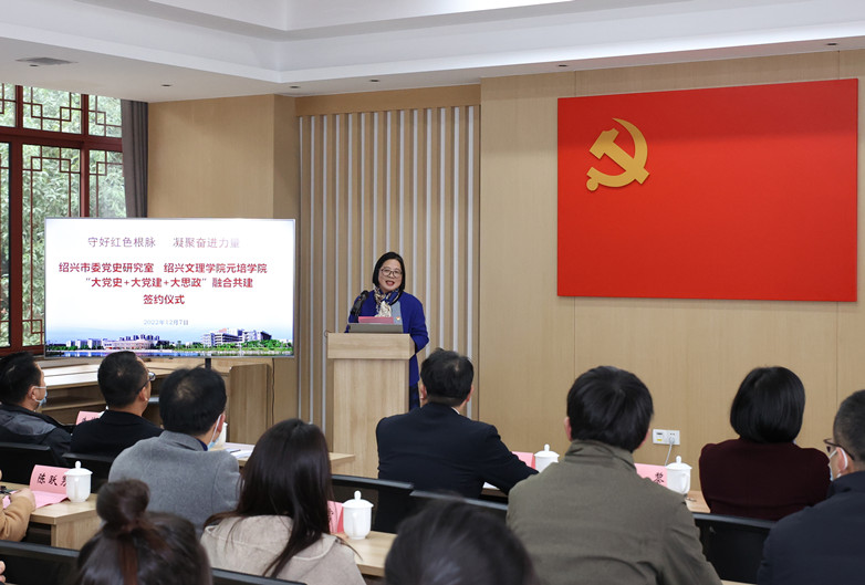 梁瑜代表学院向绍兴市委党史研究室一直以来的关心支持表示感谢,并对“大党史+大党建+大思政”融合共建提出三点期待与展望:一是要强化党建引领,提高合作站位。按照党建引领下校地“契约化”共建工作理念,以高质量党建引领高质量发展,推进和深化合作,探索育人新机制,实现党建和人才培养发展融通共进;二是要增强使命担当,提升合作内涵。以浓厚的家国情怀和强烈的社会责任感,扛起守好“红色根脉”使命担当,积极参与市委党史研究室的研究项目,产出研究成果,为党和人民述学立论、建言献策;三是要强化育人实效,赓续红色血脉。充分利用和发挥绍兴党史资源和市委党史研究室的党史研究成果,在大学生中开展绍兴党史理论和实践教学,从党史中汲取不断前进的智慧和力量,共同推进“大思政课”建设。