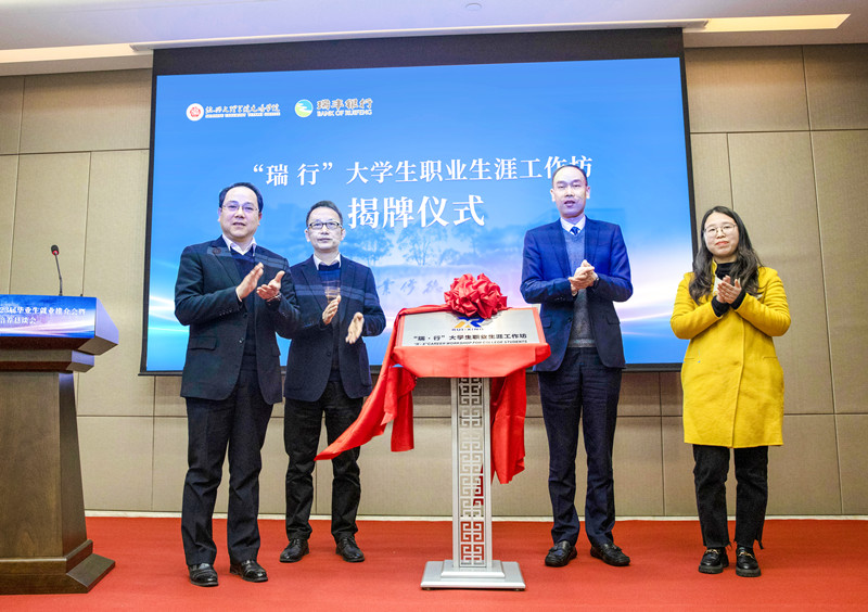 会上举行了学院与瑞丰银行合作共建“瑞行”大学生职业生涯工作坊揭牌仪式。学院与瑞丰银行将协同探索建设校企合作共建模式下的大学生职业生涯教育基地,合作开发职业生涯规划课程、职业生涯规划领域品牌活动等,构建形成多层次多维度的大学生职业生涯指导体系。