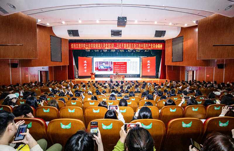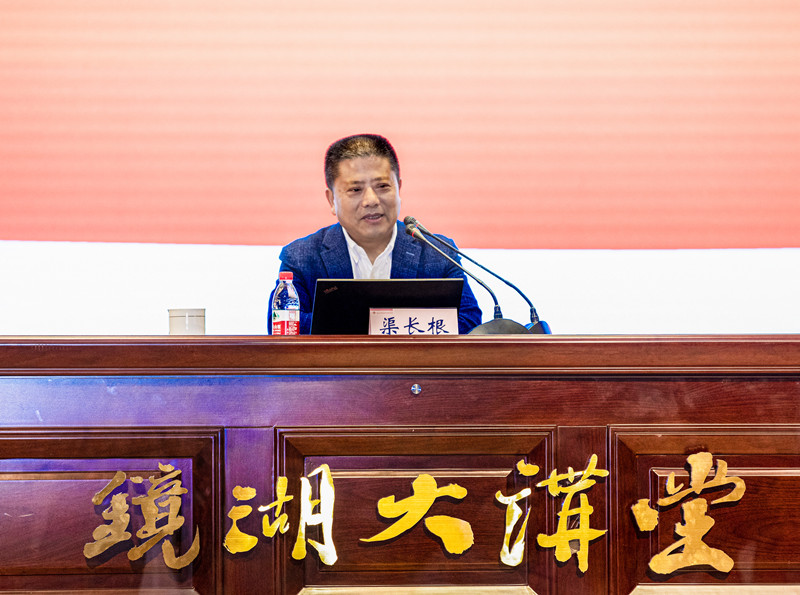 4月20日下午,“镜湖大讲堂”第3讲在国际文化交流中心报告厅举行。浙江理工大学红色文化研究院院长、马院原院长、思政课国家教指委委员、中国红色文化研究会常务理事渠长根应邀作《习近平重视源自浙江的中国共产党革命精神》报告,为学院师生带来了一堂别开生面的主题党课。绍兴市委党史研究室主任朱全红、副主任郑红光、朱伟明,学院党委理论学习中心组成员、绍兴市委党史研究室党员干部、学院优秀党员师生代表等300余人现场聆听了报告。报告会由学院党委副书记、纪委书记俞国芬主持。