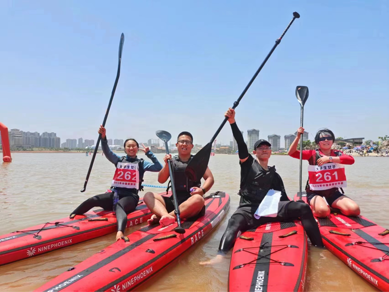 百舸争流,奋楫争先,与浪花交融。桨板比赛作为新兴水上运动项目,是奥运冲浪项目的分项,也是近年来发展势头强劲的水上运动项目。“因为我本身是校龙舟队的,主动学习桨板相关知识后,从刚接触时的小心翼翼到竞赛中的昂扬激进,整个过程乐在其中且收获颇丰。”邓万琪说。