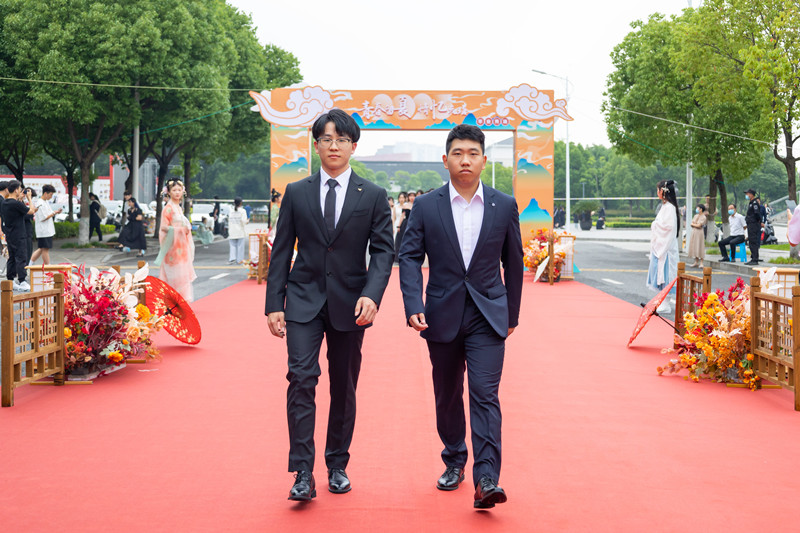 元培大道,百米红毯,花团锦簇。国际文化交流中心前,欢声笑语,氛围浓烈。在主持人的介绍下,毕业生与师长、同学、亲朋好友共同踏上这条寓意新征程的红毯,完成了人生中第一次“红毯秀”。他们或身着古色古香的汉服,或拿着明艳的鲜花,或手持素雅的纸扇,时而带着笑容招手,时而互相寒暄打趣。电商1902班金忠行从进校起就参与到了每年的红毯筹备,今年是他参与红毯礼的第四年,“走完这趟红毯,也就意味着我正式走向人生的另一段旅程。”优秀毕业生代表传播1901班杨倩激动地说:“走红毯既是荣誉的象征,也是对我们四年学习生涯的肯定,今天的我们走过了人生中最重要的一次红毯秀。”计算机1903班潘佳宇与妈妈一起参加了红毯礼,“女儿的大学四年是独立的四年,很荣幸能够参与陪伴她走完大学的最后一程。”