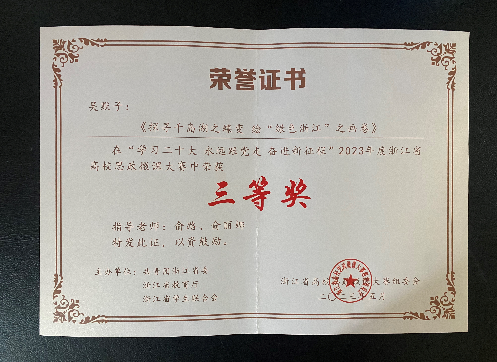 近日,由共青团浙江省委、浙江省教育厅、浙江省学生联合会共同主办的2023年度浙江省思政微课大赛成绩已公布。我院师生踊跃参与此次大赛,其中语言文学分院汉语言2103班吴默子同学的作品《探寻千岛湖之蝶变 绘“绿色浙江”之画卷》荣获三等奖。