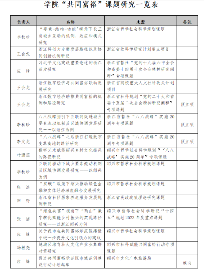 产业振兴是共同富裕的基础,产业振兴需要科技创新来支撑。学院作为一所地方性应用型高校,借助地利之便,发挥应用之能,培育乡村产业创新引擎。学院积极组织教师参与相关的课题申报、理论交流等活动,近年来积极组织申报“高质量发展建设共同富裕示范区”等相关的课题,并立项课题20余项,承接绍兴市社科赋能共同富裕行动调研课题,取得了优秀的成果。2020年7月10日,成立绍兴市文化产业研究院,积极构建科研赋能创新平台。广大教师相关文旅融合、乡村旅游、共同富裕等课题屡获浙江省文旅厅、浙江省科技厅等部门的立项资助,多篇研究报告陆续获得省市领导肯定性批示。