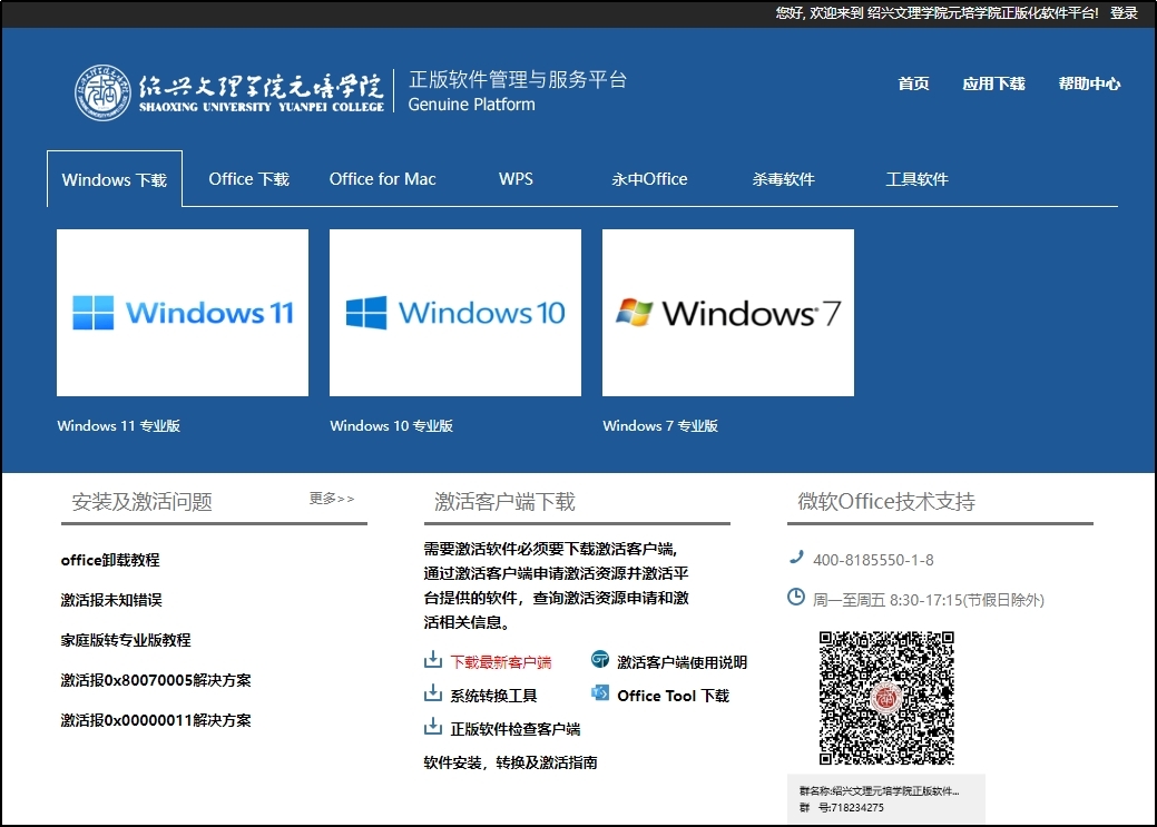 学院建立了正版化服务与管理平台,满足教职工基础应用类软件基本需求,并面向全校师生提供正版Windows操作系统、微软Office办公软件、WPS Office办公软件、永中Office办公软件和深信服EDR杀毒软件的下载和激活服务。师生可以在校园网内通过正版软件服务与管理平台下载、安装、激活、使用正版软件(登录信息门户,在业务平台—信息服务中点击“正版软件服务平台”即可访问)。