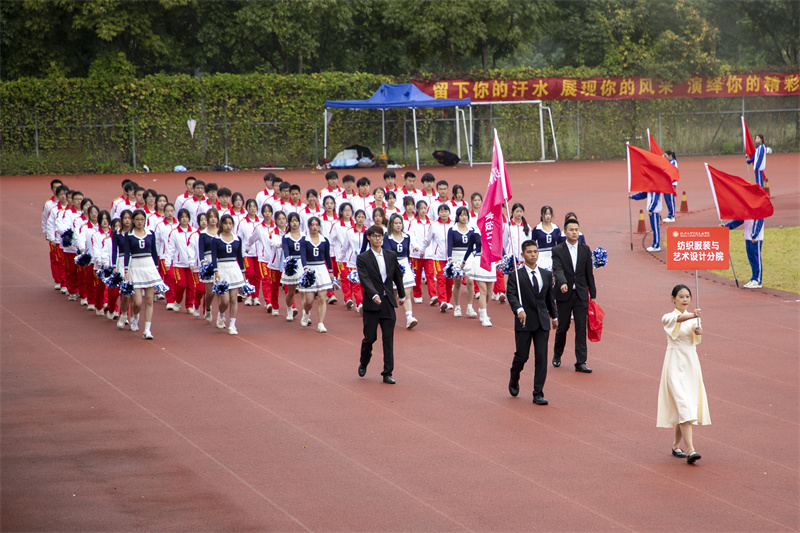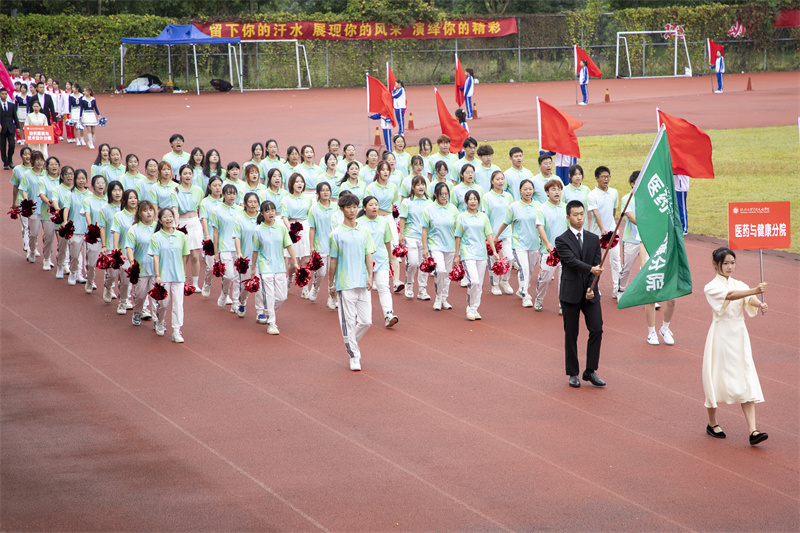 伴随着雄壮的运动员进行曲,国旗护卫队、院红旗队以及各二级分院方阵有序走来。迎着冉冉升起的五星红旗,全场师生庄严肃立,面向国旗行注目礼。