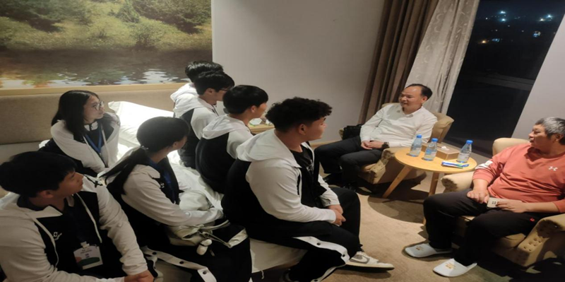学院党委副书记石旭明赛前给运动员加油鼓劲