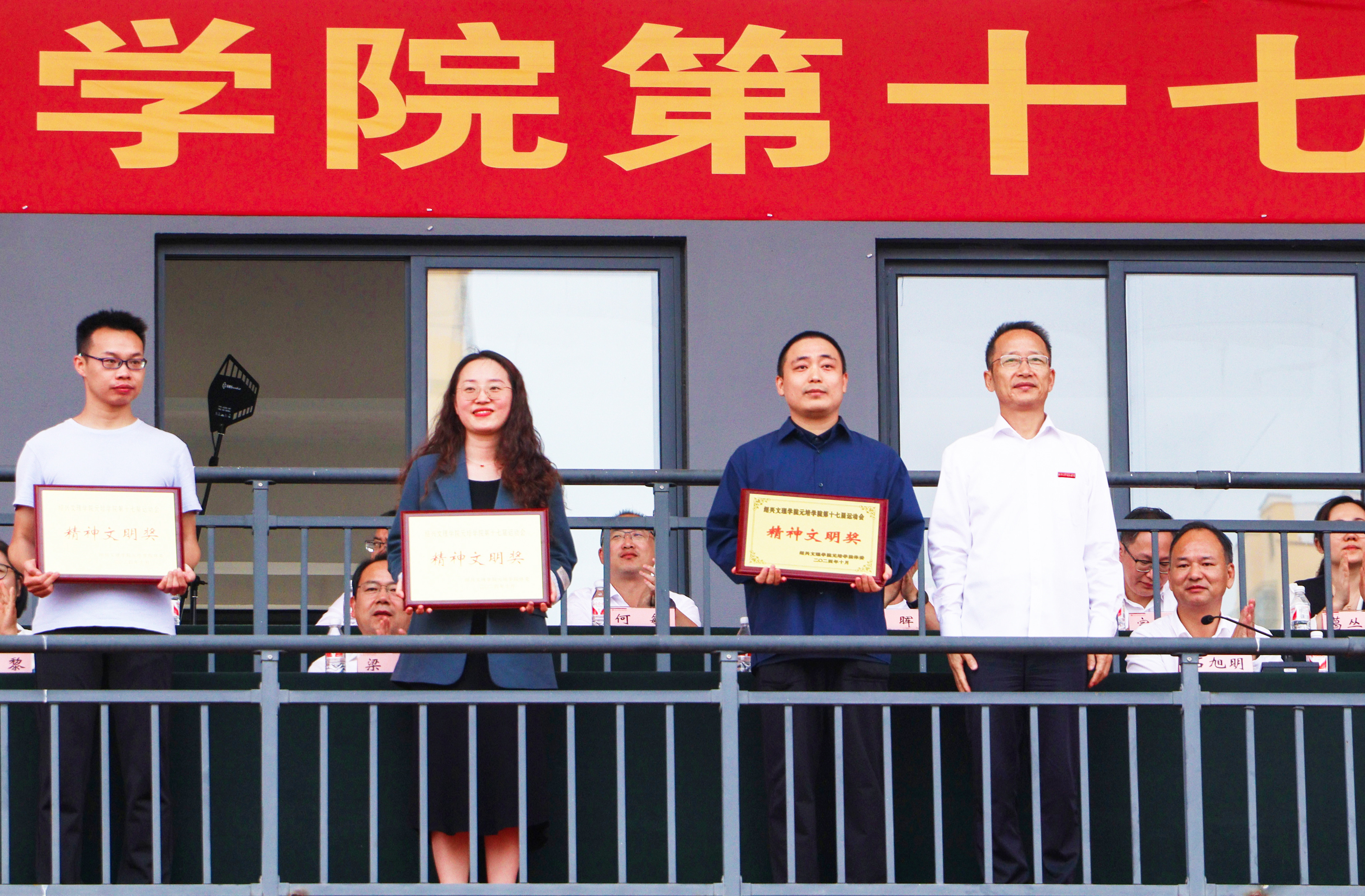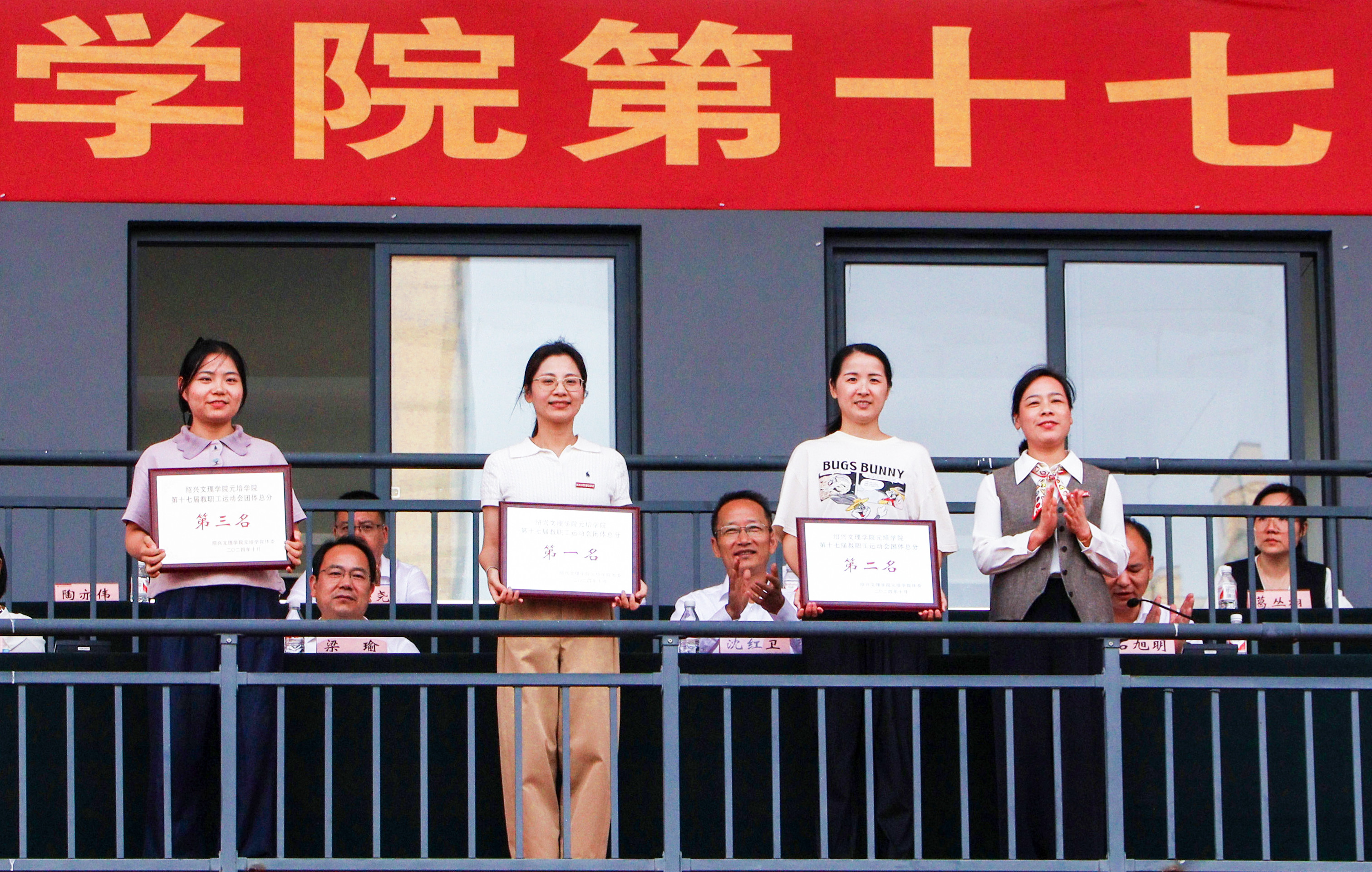院领导为获奖代表队颁发奖牌,信息与机电工程分院、医药与健康分院和建筑工程分院荣获学生团体比赛前三名;建筑工程分院、纺织服装与艺术设计分院和医药与健康分院荣获精神文明奖;机关分工会第三小组、机关分工会第一小组和信息与机电工程分院分工会荣获教工组团体前三名。