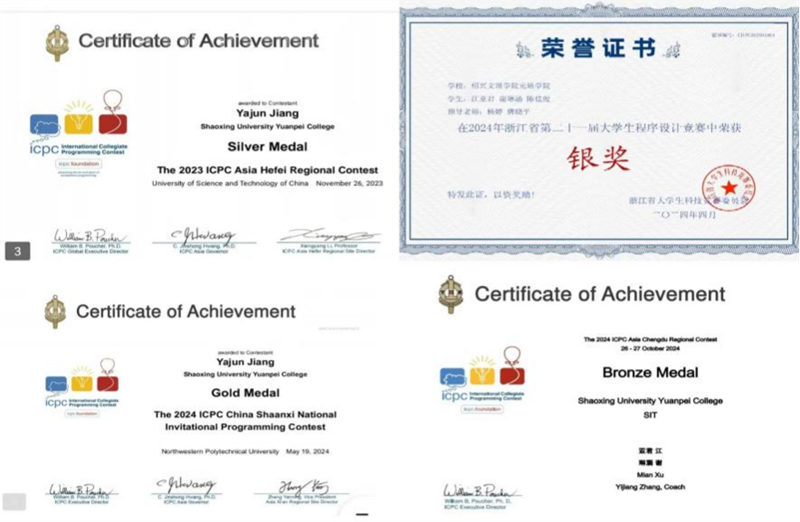 坚持所热爱的,一往无前的走自己的路。从一开始默默无闻地陪跑,到走出绍兴、冲出浙江、走向全国;从不被普遍认可,到其他参赛队伍成员口中的那句“这所学院的团队都很厉害”;从站在台下羡慕别人站上领奖台,到站上领奖台得到评审老师的一致肯定,这个过程从来不是一帆风顺。2023年国际大学生程序设计比赛亚洲预选赛上,江亚君和他的队友在合肥荣获银奖,再次刷新最好成绩;第48届国际大学生程序设计竞赛(陕西邀请赛)上,他们又将金牌收入囊中。
