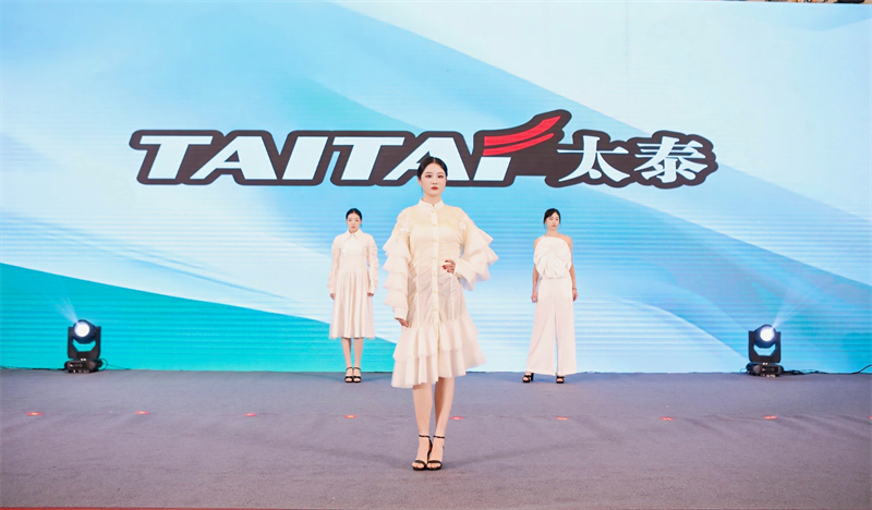 走秀现场,模特们身着精心制作的汉代、唐代、清代和民国时期的华美服饰,步履轻盈,风姿绰约。现场观众沉浸其中,感受着每一套服装承载着的文化内涵和跨越千年的华服魅力。古装走秀过后,模特们又身着由永记针纺、太泰纺织、隆豪色织、三川纺织、金卡国际等会员企业提供的现代服装惊艳亮相。