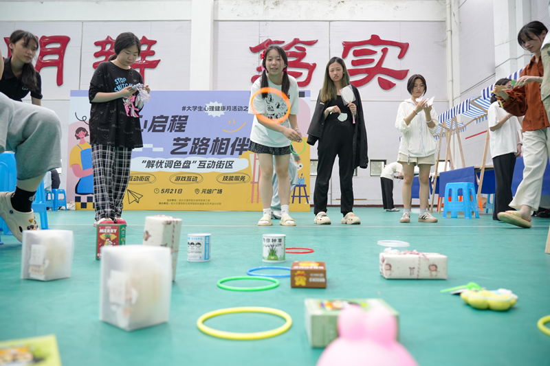 活动以艺术、运动、创意和沉浸式体验等形式展开,提供系列丰富的心理调适途径。在“艺心启程·艺路相伴”互动街区,同学们参与即兴绘画、手工创作趣味游园等活动,借助艺术疗愈心灵探寻爱的力量“五育润心,沐光同行”心理趣味运动会将运动与心理调适相结合,让同学们在欢声笑语中缓解压力;创意绘画与互动艺术体验环节以画笔和色彩为纽带,引导同学们绘出心声;手作工坊带领同学们亲手制作风铃,在游戏中学习知识,感受温暖与欢乐。