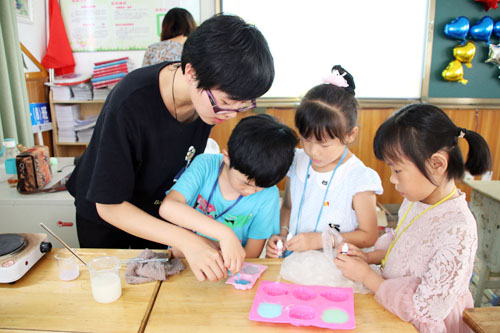 记者走进教室,看到该系药学专业的学生们正在为小学生们利用视频简单讲解手工皂热制法的四个步骤以及正确洗手的方式,一旁的桌上摆放着各种不同种类的植物油、量杯和形状各异的模具,该系药品创业社社长许露一边制作,一边耐心地向小学生们讲解制作过程。许露说,手工皂中没有添加有害工业剂,将纯天然的植物白色皂基或透明皂基加热溶解,加入所需天然色素和起泡剂、防腐剂、香精,倒入模具中成型,健康又环保。