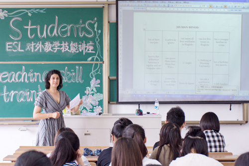 6月1日,正值六一儿童节。我院召开了主题为“Students’ teaching skill training”的ESL对外教学技能讲座,并有幸邀请到了加拿大亚岗昆学院资深TES、FL课程教师和培训师Marlaina Riggio主讲教学策略和教学方法。
