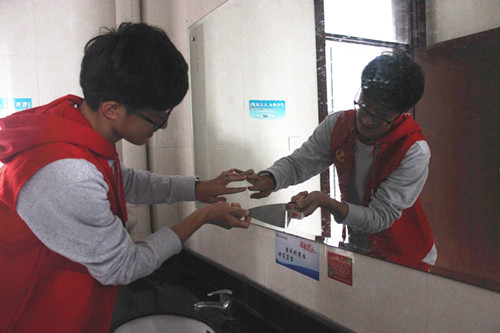 “这些小广告大多使用不干胶粘贴,必须要先用抹布浸湿后,再用铲子一点点铲除,彻底清除需要耗费一些时间”。负责校园除藓活动的志愿者告诉记者。近日,学院党员之家与大学生媒体中心74位志愿者实地走访校园,进一步加强宣传环境巡查,落实做好公共区域卫生保洁和卫生死角处理处置工作,开展了两次校园除藓活动,成效显著。