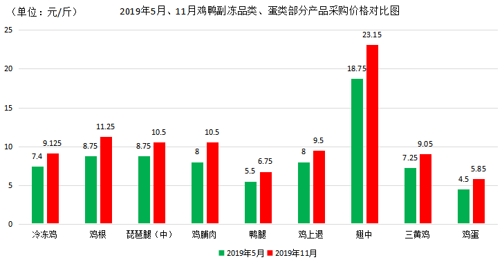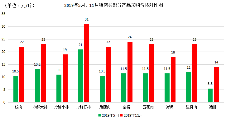 今年5月份以来,猪肉百年不遇的价格飙升,我院食堂采购的统肉由5月份的10.5元/斤上涨到11月份的22元/斤,涨幅达109.52%。伴随猪肉价格上涨,鸡、鸭等其他肉类、蛋类产品也随之大幅上涨。据统计,冷鲜大排涨幅74.24%,后腿肉109.52%,猪蹄56.52%,猪肝154.55%,鸡脯肉31.25%,鸭腿22.73%,鸡蛋30.00%。食品原材料成本的大幅增加,给学院食堂餐饮服务保障带来了巨大压力。