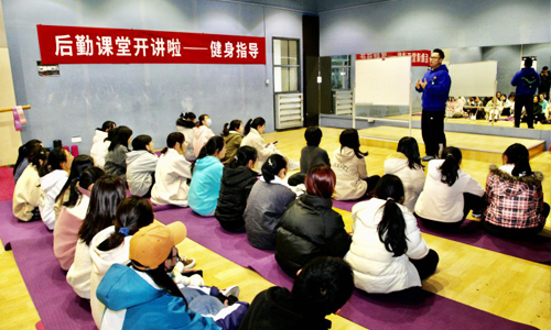 活动现场,具有近10年从业经验的专业健身教练沈淼从大众健身的理念、了解增肌与减脂塑形、健康饮食与健身、身体体脂成分分析等方面,采取了示范引导与现场互动相结合的方式,系统介绍了如何注意饮食、训练、休息之前的调节,根据体脂数据制定科学饮食计划,以及有效锻炼肩、腹、腿等重点部位的方法。在健身器材体验区,教练重点讲授了动感单车、推肩椅、卧推架、哑铃等健身器械使用以及健身注意事项课程。在教练的带动和指导下,学生们很快投入到音乐和动作之中,亲身体验通过运动器材对腿部、腰部及手臂力量的训练,经过近一个小时的运动,很好地达到了健身运动的效果。