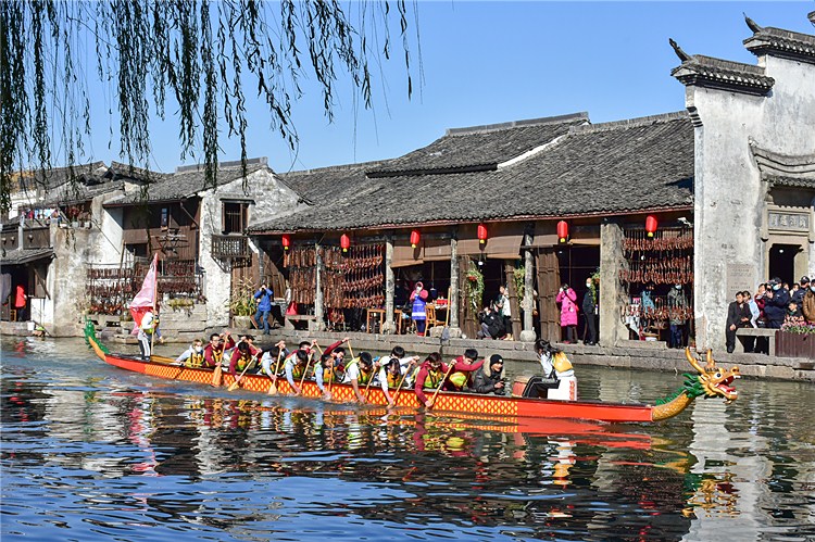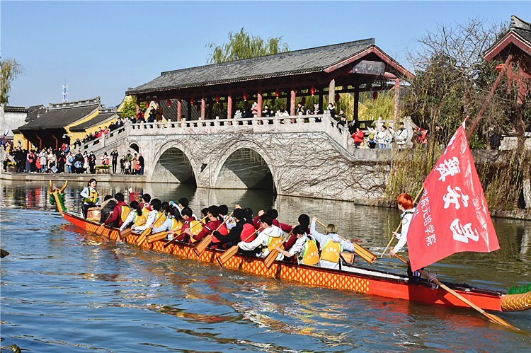 “龙腾腊月,舟舞安昌,预祝风情节圆满成功!”活动现场,我院四十余名龙舟队员伴着鼓点,铿锵有力地喊着号子。桨板起落之间,水花溅起,两艘龙舟一大一小,一前一后,龙头、龙尾相互竞逐安昌河中,舟上击鼓声、戏台上调子声、河边人群呐喊助威声汇成一片,热闹非凡,为安昌古镇居民和游客送上了一场水上盛宴。