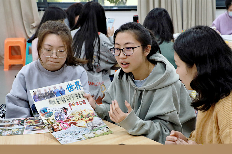 “我做的主题是‘加油中国’,疫情期间医护人员和志愿者‘舍小家为大家’的大爱精神令我十分触动”,“我的是祖国的大好河山和多彩风景,希望有一天能切身感受到祖国各地不同的魅力”,“经济、军事、农业、教育,我想展示中国的生生不息”......学生们围成一桌,分享着自己对祖国的“爱”。