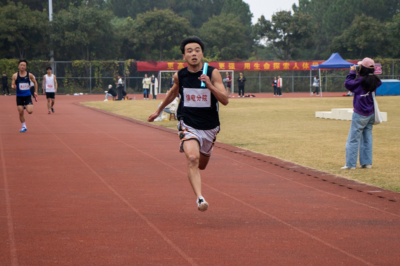 在男子4×100米接力赛上,信息与机电工程分院团队以47秒10的成绩获得冠军。这支队伍分别由一棒机自1901班应金科、二棒自动化2001班赵泽林、三棒计算机2002班姜聪聪、四棒机自1901班陈炜豪组成。他们秉持着“稳接棒、不掉棒”的信念,齐心协力,以领先第二名0.6秒的优势获胜。