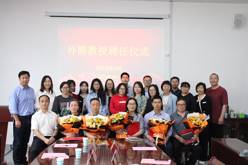 4月19日下午,语言文学分院举行外聘教授聘任仪式。学院副院长周思红为孟伟根、曹禧修等5位外聘教授颁发聘书。分院党政班子成员、教授代表、青年教师等参加仪式。