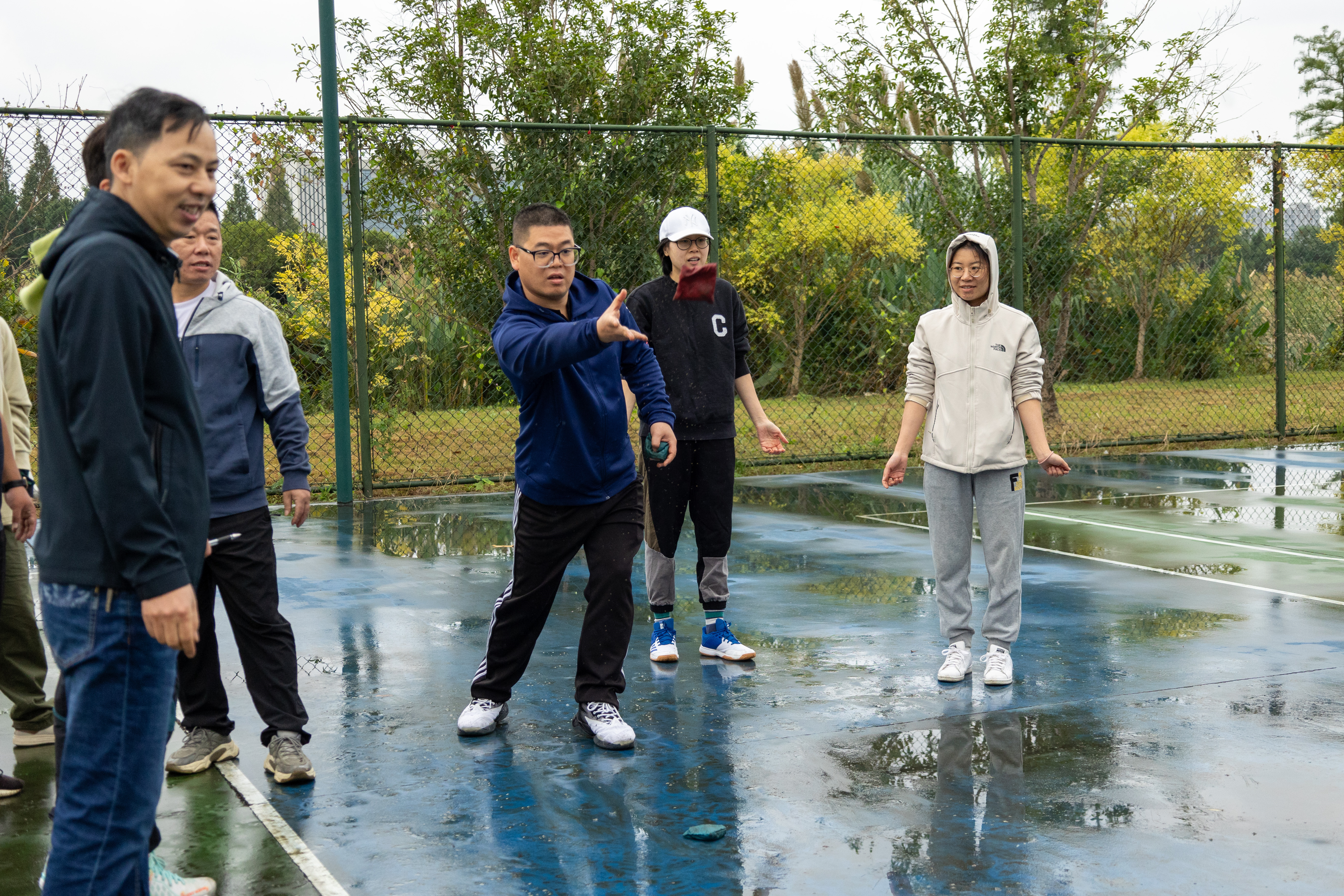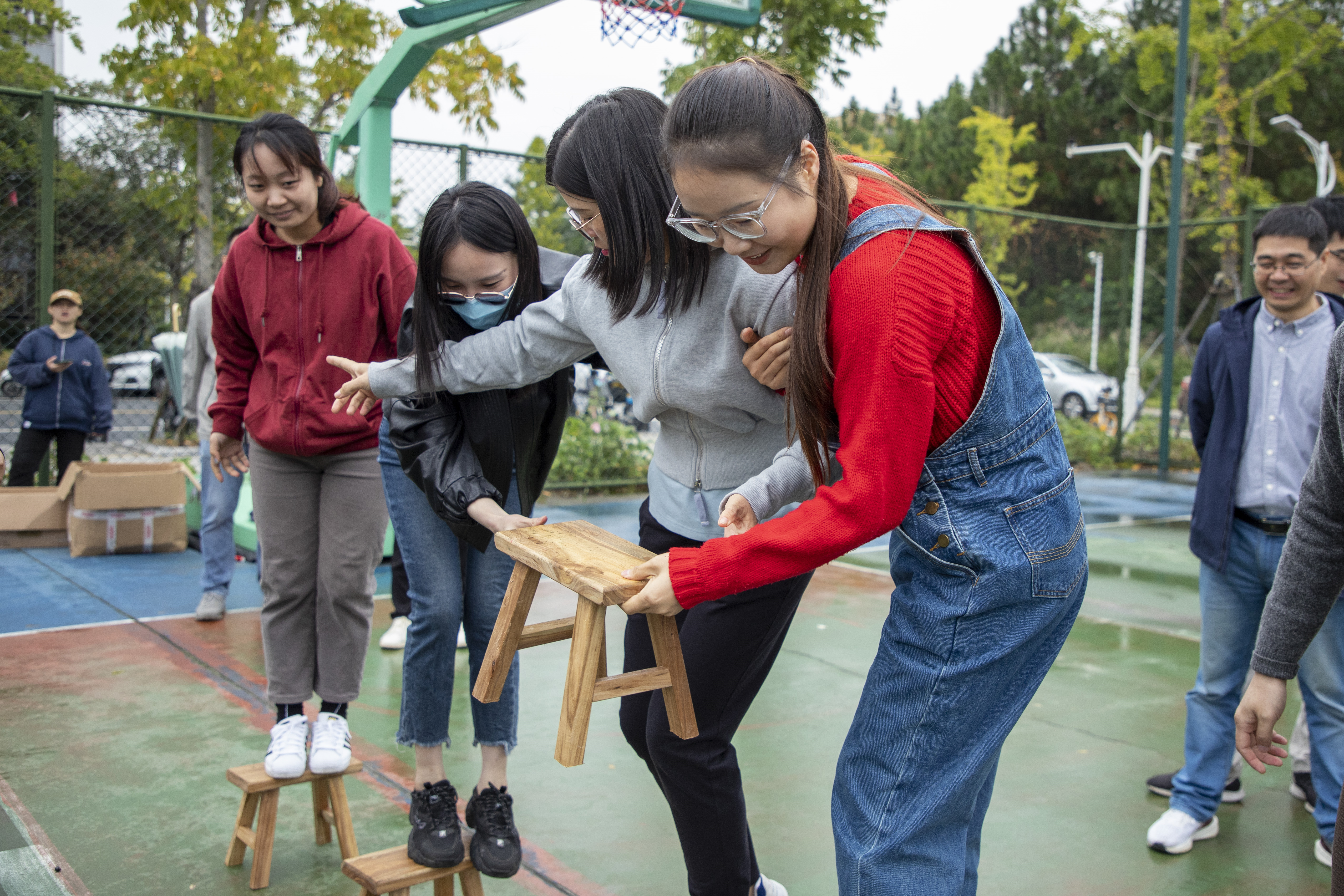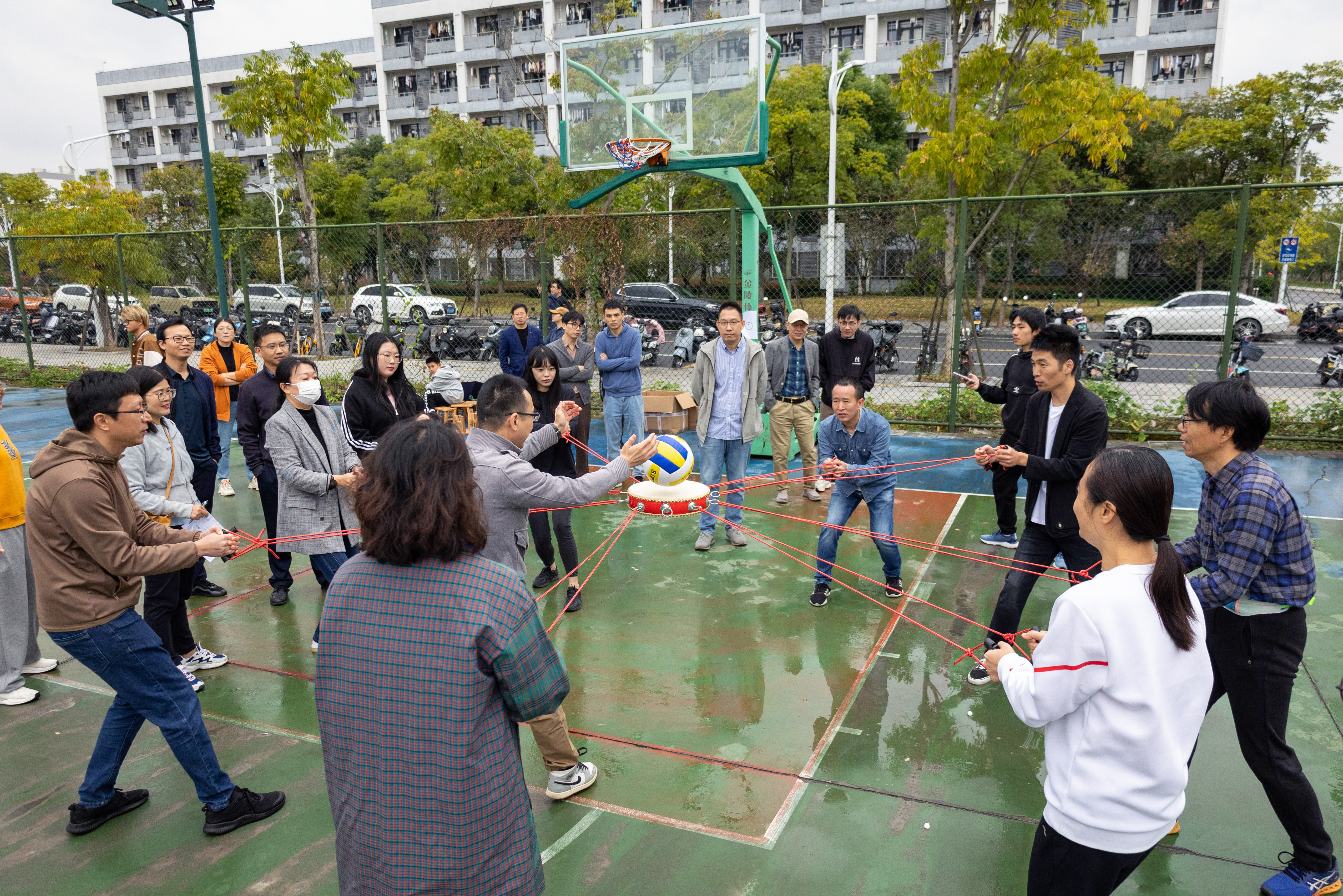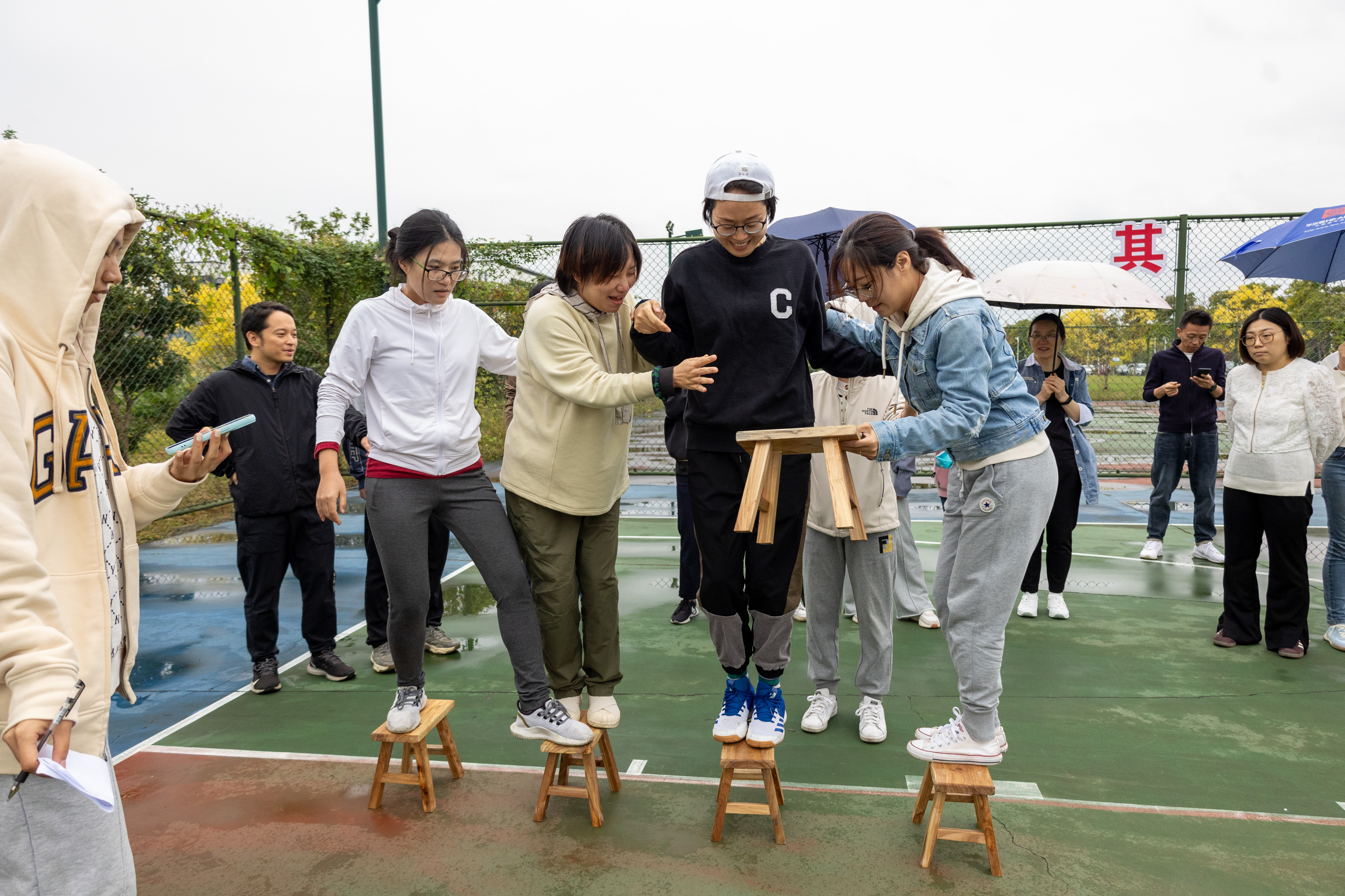 比赛中,老师们认真研究着“不倒森林”的小秘诀:“身体一定要笔直”,高喊整齐的口号“1212”。“同心击鼓”以鼓声奏响华美乐章,弓着步,弯起腰,随着排球的飞跃跳动着,向上向上再向上,铿锵有力的鼓声传达出大家昂扬的斗志和进取的精神。“板凳接龙”诠释了若想走得远,必须先走得稳,每一个人手搀着手,肩扶着肩,将小小的板凳传得既快又稳。“沙包掷准”要求瞄准目标,迅速挥臂,各队伍或用力,或轻柔,尽显神通,沙包在天空划过一条优美的弧线。“珠行千里”则要求将乒乓球从一端连续传递到另一端,在保证速度的同时考验互相配合的默契。