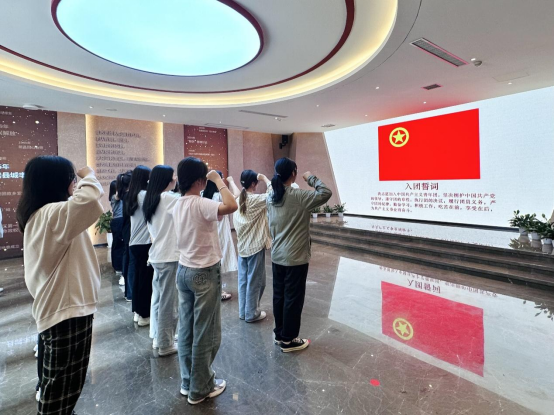 展馆内,同学们认真聆听“先烈的力量 建党初期的绍兴人”主题党课,深入了解建党初期绍兴杰出英才先进事迹,并在团旗下重温入团誓词,进行庄严宣誓。