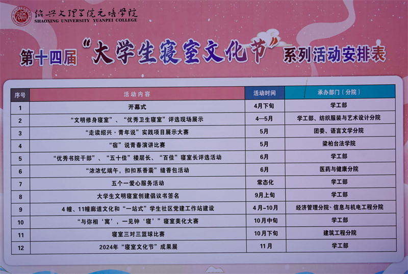 本届寝室文化节于4-11月期间开展,在原有品牌活动基础上,今年,还新增了“走读绍兴·青年说”实践项目展示大赛、“宿”说青春演讲比赛、寝室三对三篮球比赛、“五个一”爱心服务等12项形式多样的活动,力求实现活动覆盖面最大化、活动种类多元化、活动时间长期化,使全体同学都能在活动中提升、在体验中成长、在参与中收获。