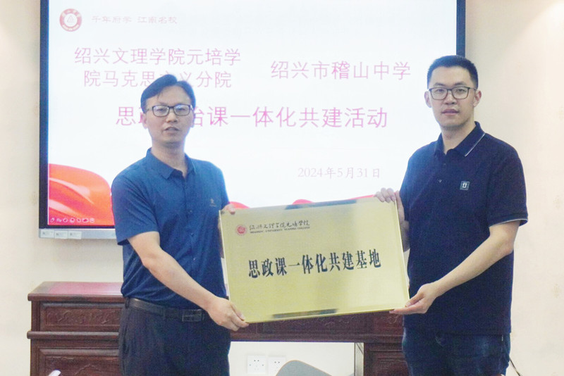 会上,双方负责人表示,将通过共建活动,将思政小课堂和社会大课堂有机结合,强化各学段思政课一体化改革创新,探索出一条遵循教育发展规律、适合时代发展需要、体现不同学段特点的思政课一体化共同体建设道路。双方负责人共同为“思政课一体化共建基地”授牌。马克思主义分院负责人为稽山中学全体思政课教师作思政课一体化建设讲座。
