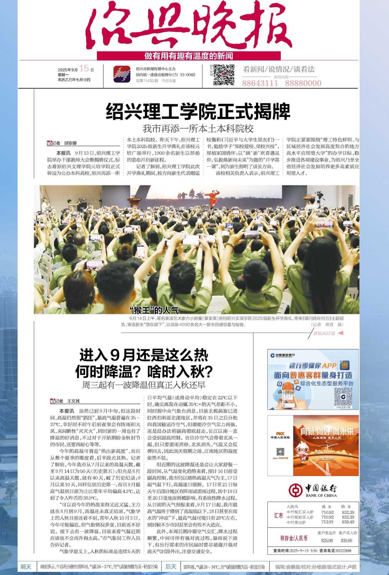 9月15日,绍兴晚报头版头条以“绍兴理工学院正式揭牌 我市再添一所本土本科院校”为题,报道绍兴理工学院2025级新生开学典礼在学校元培广场举行,1900余名新生以昂扬的姿态开启新征程。新闻链接如下: