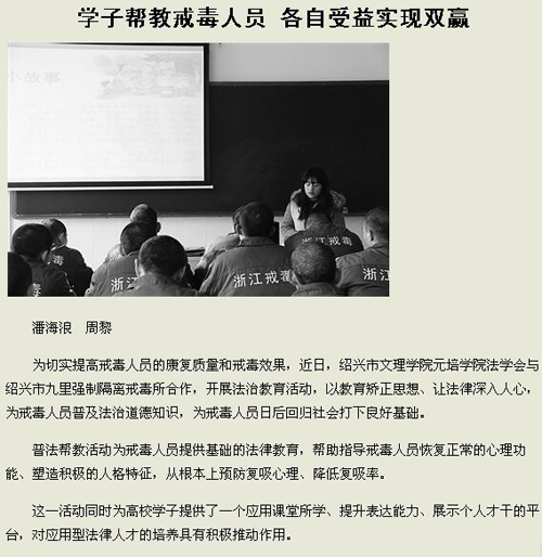 近日,《浙江法制报》以“学子帮教戒毒人员 各自受益实现双赢为题报道我院法学专业学生与绍兴市九里强制隔离戒毒所合作,开展法治教育活动。全文如下: