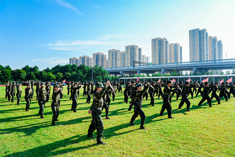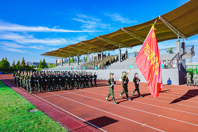 上午7时,伴随着中华人民共和国国歌《义勇军进行曲》的激昂旋律,五星红旗冉冉升起,全体人员肃立,行注目礼、高唱国歌。升旗仪式后,《分列式进行曲》奏响,军训团护旗队昂首擎旗、步伐坚定率先入场,各连队方阵紧随其后,迈着铿锵正步,依次通过主席台接受检阅,新生们以挺拔身姿、饱满精神与昂扬斗志,充分展现数日以来的军训成果与新时代青年的青春风貌。随后,军事技能展示环节有序开展,赢得现场师生阵阵掌声。