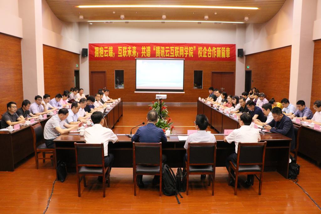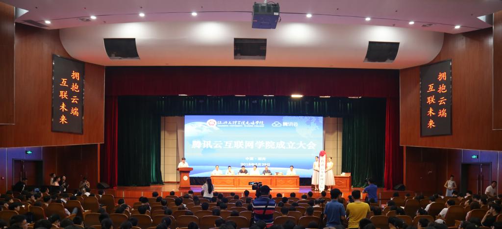 “拥抱云端、互联未来”!2018年5月29日上午,绍兴文理学院元培学院、腾讯云合作共建“腾讯云互联网学院”成立大会在绍兴文理学院元培学院国际交流中心隆重举行。绍兴文理学院校长、元培学院董事长王建力,绍兴市教育工委委员、教育局副局长马成永,绍兴市科技局副局长王国飙 ,腾讯云教育行业总经理龚振,校企合作企业代表,学院全体领导出席大会。大会由学院党委书记梁瑜主持。学院中层干部、信息与机电工程分院全体师生及其他部分师生代表等500余人参加大会,共同见证“腾讯云互联网学院”成立。