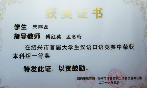 朱燕磊:语言文学分院汉语言文学专业(专升本)2016级学生,曾获绍兴市首届大学生汉语口语竞赛一等奖。