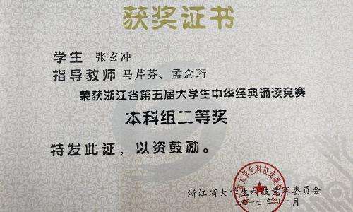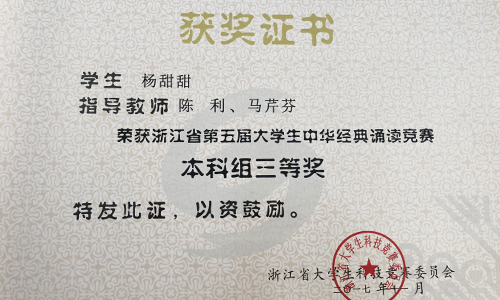 王嘉楠:汉语言文学专业2017级学生,获浙江省中华经典诵读竞赛省二等奖,绍兴市第三届中华经典诵读竞赛中获市一等奖。