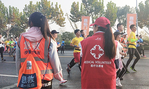 院青协志愿者负责人吴鹏飞同学说,这是他第三年带领团队为马拉松做志愿者服务,能够为选手们加油打气,为他们的生命安全保驾护航,感觉非常有意义!据了解,因本届马拉松比赛参赛人数较多,为了做好保障和服务工作,200名志愿者和5名团一线带队老师于凌晨3点45分出发,4点多便来到各自岗位待命,帮助医护人员们做好赛前准备工作。为防止突发事件,志愿者和带队老师半个月前就接受了为期两天的心肺复苏等专业知识培训,并多次勘察赛道熟悉环境。