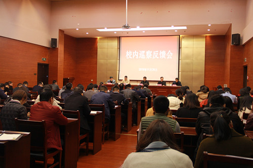 11月26日下午,校内巡察反馈会在图书馆828会议中心举行。巡察工作领导小组常务副组长、校纪委书记邱卫东,巡察工作领导小组副组长、校党委组织部长宣绍龙,第一巡察工作组组长、校纪委副书记傅建中、副组长封国强及相关成员出席反馈会。学院党政班子成员、主管及以上干部、各党支部书记、各分院系主任(教研室主任)、综合办主任、高学历高级职称代表、普通一线教职工代表参加反馈会。巡察工作领导小组副组长、校党委组织部长宣绍龙主持反馈会。