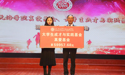 学院历来重视对学生社会责任感教育,为充分激发我院学生的感恩和责任意识,展示我院学生“真诚互助,爱心奉献”的良好精神面貌,继承和发扬学院“精诚团结,互帮互助”的优良传统,学院从2003年成立“真爱基金”,2016年成立“绍兴文理学院元培学院大学生成才与实践基金”。今年,我院学生又积极向大学生真爱基金与大学生成才与实践基金开展捐赠。截至目前,捐赠金额已达59997元,服饰1501班林雨婷作为捐赠者代表上台捐赠,学院党委副书记宣海江代表学院接受捐赠。