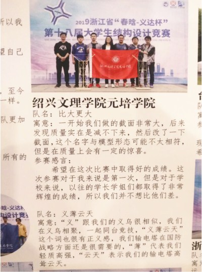 大学生结构设计竞赛是教育部和财政部联合发文批准首批全国大学生九大学科竞赛之一,是浙江省教育厅高教处批准的32大类学科竞赛项目之一,是以培养当代大学生创新思维和实践动手能力、培养团队意识,增强大学生工程结构设计与实践能力为宗旨的高水平学科竞赛。