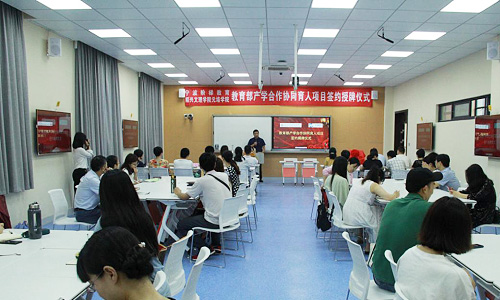 6月20日,智慧教室启用暨教育部产学合作协同育人项目签约仪式在学院1号教学楼顺利举行。学院副院长李黎、宁波阶梯教育科技有限公司副总经理陈理、相关部门负责人、分院教学院长以及任课老师参加此次仪式。