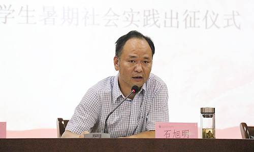 石旭明指出,开展社会实践是贯彻党的教育方针的重要措施,是加强和改进高校思想政治教育的重要途径,是大学生奉献社会、报效国家的有效载体,对同学们了解社会、认识国情,增长才干、增进与工农群众的感情、增强社会责任感具有不可替代的作用。他强调,习近平总书记系列重要讲话精神指出,青年大学生最富有梦想与朝气,正处于人生的“拔节孕穗期”,最需要精心引导和栽培,我们组织开展大学生社会实践活动,就是要以回溯初心为主题,要以担当使命为旨归,要以自觉践行为目标,勤于实践,勇于实践。希望同学们都能在社会实践中感受奉献的快乐,增进对社会的了解,提高对经济社会发展现状的认识,努力实现书本知识和实践知识的更好结合,全面树立正确的世界观、人生观和价值观,在实践中长知识、增才干、有作为。