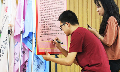 出征仪式上,带队教师代表卢小盼和暑期社会实践团队学生代表李京哲和程毅超同学分别作表态发言。15支学生队伍负责人依次上台签订暑期社会实践承诺书,并接受授旗。