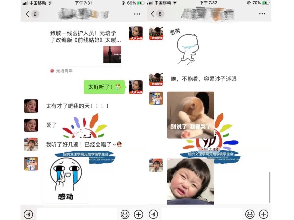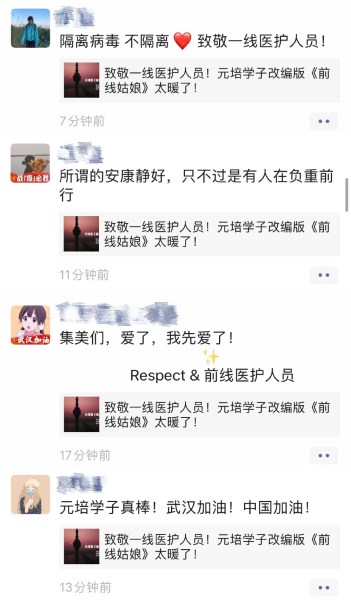 “疫情下,医院病房,是前线的姑娘,你身披着白色的盔甲,你双手已受伤……”近日,一首歌曲《前线姑娘》在元培学院师生朋友圈间广为流传,该歌曲由绍兴文理学院元培学院学生江伶俐将歌曲《桥边姑娘》进行歌词改编,用歌声声援正在防疫一线奋战的巾帼战士们。歌曲一经发出,学院师生便纷纷转发推荐,大家纷纷表示“歌词深入人心,朗朗上口,歌曲温暖有爱,满满正能量,已经都会唱了”。不少师生更是用“想哭”、“感动”和“泪目”、“加油”的表情包,表达着内心的感受。