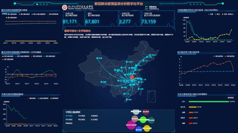 近日,学院东盟经济研究院内,最新一日全球主要国家和地区新增确诊病例数、各类病例累计数量较前一日变幅以及未来预测走势等多项数据在巨型电子屏上详细显示着,并不断有更新后的数字和智能文字实时在屏幕上“跳动”,各色图表、数据线构成了一张全球与全国新冠肺炎疫情信息数字化“大地图”。据介绍,这是东盟经济研究院基于人工智能图文分析技术打造推出的新冠肺炎疫情监测分析数字化平台,旨在助力数字化抗疫精准发力,为抗击疫情提供专业化支撑。