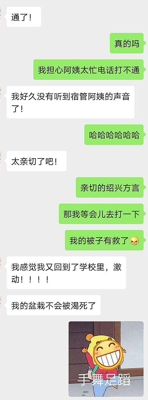 “老师,我的被子会不会长毛啊!老师,我阳台上的盆栽估计快要烤焦了!老师,我们寝室忘记扔的垃圾它还好吗?老师,我没吃完的水果会不会已经被虫子和毒气成功霸占啦?老师,我桌子上的小金鱼要被饿死了!老师,我晾在寝室没收的衣服已经一层灰了……”“宿管阿姨在,这都不是事儿!”最近,我院学工部组织书院复工宿舍管理员开展“在线爱心接单服务”,学生倍感暖心,纷纷为学院的行为点赞。