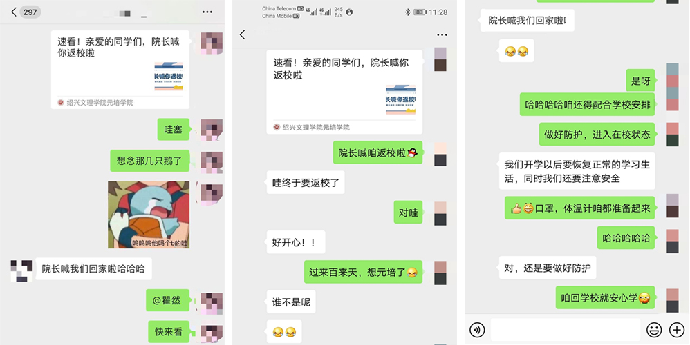 同学们通过手机、电脑等多种方式观看了这段视频。期间,同学们在聊天群里积极参与在线讨论,第一时间分享了他们发自内心的感受和感动,纷纷表达了在疫情特殊时期对母校和老师们亲切关怀、倾情付出的感谢之情,以及努力学习,攻克时艰的信心和决心。