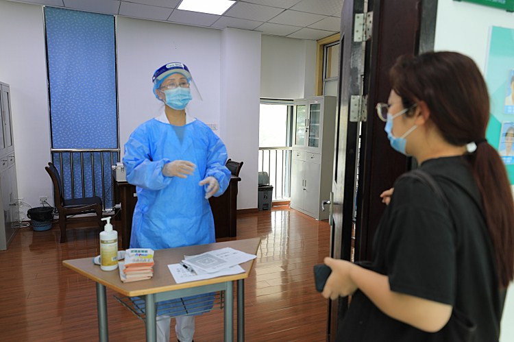 校园疫情防控工作责任重,任务繁杂,无论是中午十二点还是凌晨一点,无论是教学楼还是寝室,一旦有同学身体不适,当日值班医生就会第一时间赶到并依照流程处置。“处置流程看似简单,但学生人数一旦增加,工作量便会成倍地加大。以测温为例简单计算,每人都进行隔十分钟三次体温复测,一位同学就是半个小时,十位同学就是五个小时。”庞大的工作量,不间断的工作,刘跃民常常都忙得顾不上中饭晚饭,更别提午间休息。“我做医生挺多年了,忙碌已司空见惯,我们多一份担当,学生也就多一份平安。”她说。