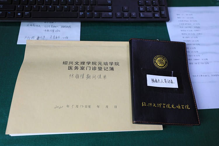 记者走进医务室时,刘跃民正埋头伏案,忙着整理当天隔离点和医务室的数据。已快见底的记录本,满满记录着隔离点师生每日两次的体温数据和药物配送情况,以及隔离人员后续就诊信息跟踪报告。每一个字,每一组数据,尽显刘跃民一行人的细心与认真。