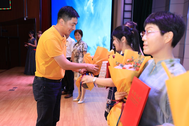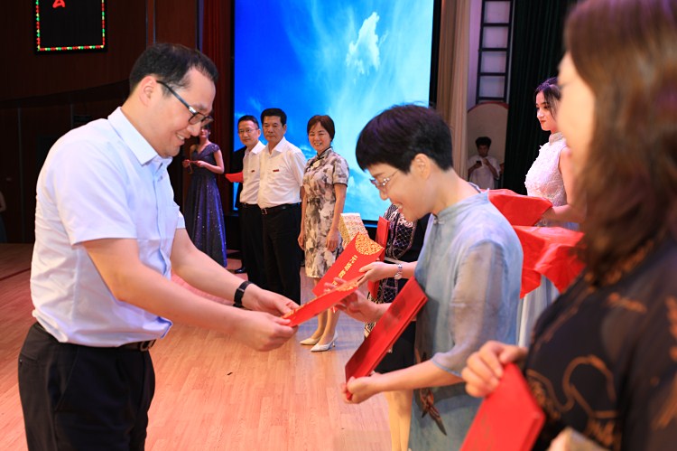 晚会上,学院教师最高奖“元培教师奖”颁奖仪式举行。学院副院长李黎宣读表彰文件。郝敬习、叶访春、沈红卫分别为获奖者纺织服装与艺术设计分院楼利琴老师、医药与健康分院杜轶君老师、经济管理分院蒋江林老师颁发颁奖词书法卷轴和荣誉证书。金汉强为三位获奖教师颁发奖金红包。石生元为三位获奖教师献花。