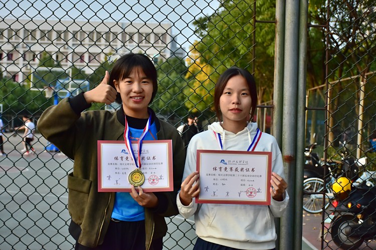 女子3000米项目第一名郑慧同学(左一)、女子800米项目第一名蒋丽同学(右一)合影
