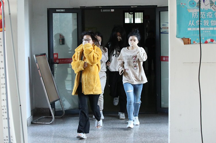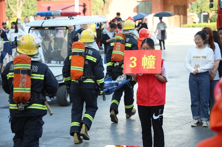 演练现场,学生公寓2幢311、418突然出现浓烟,保卫处接到险情报告后,立即根据应急处置程序召集校园义务消防员、物业安保人员进行安全疏散,同时报告越城区消防救援大队。经过五分钟的疏散,300余名学生有序疏散至公寓广场,并按照楼幢列队。医务室对赶至现场负责受伤的学生进行救援。